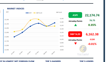 Reversing yesterday’s profit taking position, Colombo Bourse exhibited buying sentiment during the day. ASPI ended in green territory and ended the day at 22,175, gaining 77 points from yesterday, largely contributed by the upward movement in blue-chip companies.