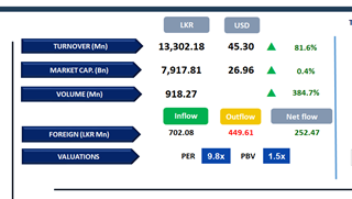 COMB, DIMO, BUKI, CARS and WIND were the top positive contributors to the index. Turnover stood at LKR 13.3Bn, reflecting an increase of 90% compared to the monthly average that stands at LKR 7.0Bn.