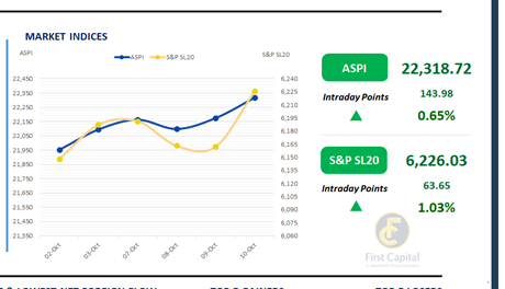 Buoyed by the persistence of positive tone, Colombo Bourse moved upward, driven by the contribution from a mix of sectors. The ASPI ended at 22,319, up by 144 points.
