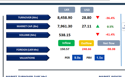 Additionally, higher gains were observed in CFVF, due to the announcement of cash dividends and higher HNW participation was observed towards ACL, due to the sub division of shares. Moreover, continued investor participation was observed in penny stocks, similar to yesterday’s session. Foreign investors turned net sellers, recording a net outflow of LKR 98.1Mn.