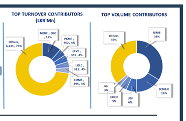 Turnover stood at LKR 8.5Bn, reflecting an increase of 16% compared to the monthly average that stands at LKR 7.3Bn. Diversified Financials sector took the lead in terms of sector-wise contribution to turnover, with a share of 37%, while Banks and Capital Goods sector jointly contributed 30%.