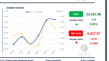 The ASPI closed at 22,321, marking a marginal gain of 2 points compared to the previous session. Both retail and HNW participation remained average. Top positive contributors to the index included DIAL, CTHR, MERC, GREG, and HARI.