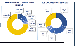 Turnover stood at LKR 5.7Bn, representing a 22% decline from the monthly average of LKR 7.3Bn. The Diversified Financials sector led sector-wise turnover contribution with a 31% share, while the Banks and Capital Goods sectors jointly accounted for 26%.