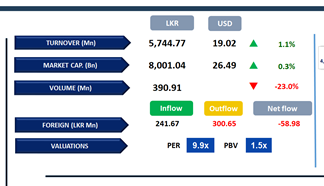 Meanwhile, market capitalization surpassed LKR 8.0Tn for the first time, marking a significant milestone. Foreign investors turned net sellers, posting a net outflow of LKR 59.0Mn.