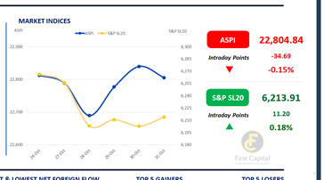 The ASPI declined by 35 points to end at 22,805. Retail participation remained moderate throughout the session, while strong HNW activity was observed, primarily driven by large-scale crossings in SPEN and LGL.