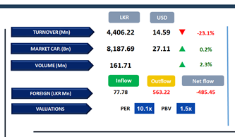 The Capital Goods sector led total turnover, contributing 28%, followed by the Food, beverage & tobacco and Banking sectors, which collectively accounted for 34%. Meanwhile, foreign investors remained net sellers, recording a net outflow of LKR 485.4Mn for the day.
