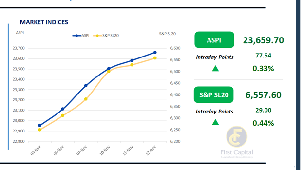 The Colombo Bourse extended its positive momentum, with the ASPI gaining 78 points to close at 23,660. Renewed investor interest was seen across low and mid-tier banking counters, while retail participation remained moderate amid continued strong HNW interest.