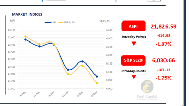After a continuous downward movement of the index, ASPI settled at 21,827 level, moving 415 points down while S&P SL 20 dipped by 107 points, closing at 6,031. Investor activity was muted with both retail and HNW showing notably lower participation