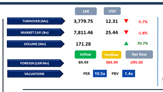 The Capital Goods sector generated 38.6% of the day’s turnover, while the Banking and Materials sectors together accounted for 26.7%. Foreign investors remained net sellers, posting a net outflow of LKR 295.5Mn.