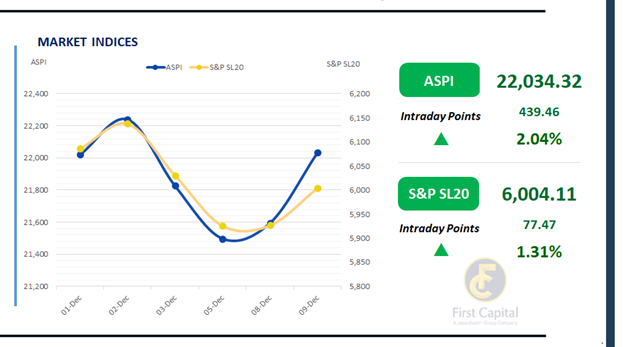 The ASPI advanced 439 points to close at 22,034, while the S&P SL20 edged up 77 points to end at 6,004. Top contributors to the ASPI were DOCK, CINS, COMB, SAMP and ACL.