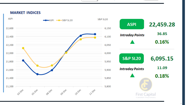 The ASPI advanced 37 points to close at 22,459, while the S&P SL20 climbed 11 points to end at 6,095. Top contributors to the ASPI were DOCK, CINS, CFIN, HHL, and SUN.