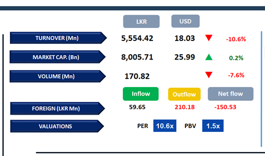 The Capital Goods sector accounted for 31% of total turnover, while the Food Beverage & Tobacco and Energy sectors contributed a combined 30%. Foreign investors remained net sellers, posting a net outflow of LKR 150.5Mn.