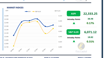 The Colombo Bourse experienced an initial dip, followed by a session of mild volatility amidst consolidation, before ultimately closing above the previous day’s level, gaining 38 points to close at 22,333, while the S&P SL20 moved up 19 points to end at 6,071.