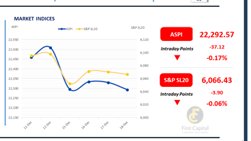 ASPI declined by 37 points to close at 22,293 and the S&P SL20 moved down by 4 points to end at 6,066. Top negative contributors to the ASPI were DOCK, SFCL, RICH, MELS and BREW.