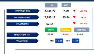 The Materials sector accounted for 27% of total turnover, while the Capital Goods and Diversified Financials sectors contributed a combined 36%. Foreign investors turned net buyers, posting a net inflow of LKR 63.8Mn.