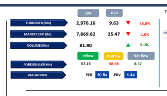 The Capital Goods sector accounted for 33% of total turnover, while the Materials and Banking sectors contributed a combined 22%. Foreign investors turned net buyers, posting a net inflow of LKR 8.6Mn.
