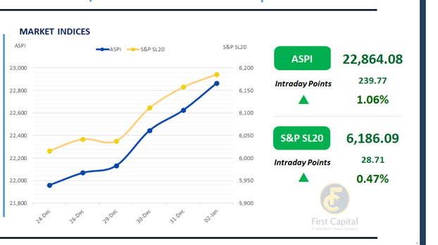 The All-Share Price Index rose by 240 points to close at 22,864, while the S&P SL20 index added 29 points to finish the day at 6,186, both ending the session firmly in positive territory. Top positive contributors to the ASPI were ACL, COMB, AEL, DFCC and DIPD.