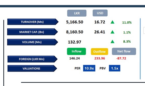 Additionally, property sector stocks edged higher over the course of the day. The Capital Goods sector contributed 46% of total turnover, while Materials sector and the Food, Beverage and Tobacco sector together accounted for 18%. Foreign investors remained net sellers, posting a net outflow of LKR 87.8Mn.