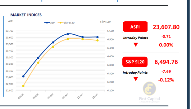 The ASPI closed at 23,608, down by nearly 1 point while S&P SL20 index moved down by 8 points to close the day at 6,495. Top negative contributors for the ASPI were JKH, DOCK, DFCC, SFCL and HHL.