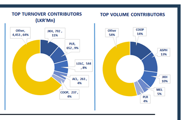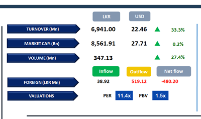 Daily turnover stood at LKR 6.9Bn, marking an increase of 9.9% over the monthly average of LKR 6.3Bn. Capital Goods sector led the daily turnover with a share of 28%, followed by the Real Estate Management & Development, and Diversified Financials sectors collectively contributing 29%. Foreign investors remained net sellers, posting a net outflow of LKR 480.2Bn.