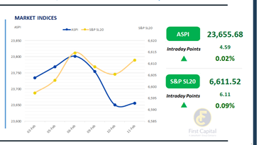 The Colombo Bourse showed a mildly positive but cautious tone during the session. Both indices experienced early volatility with a mid-morning dip, followed by a gradual recovery and sideways movement into the close.