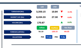 Capital Goods sector led the daily turnover with a share of 20%, followed by the Food Beverage & Tobacco, and Diversified Financials sectors collectively contributing 32%. Foreign investors remained net sellers, posting a net outflow of LKR 64.0Mn.