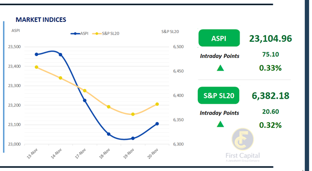 Breaking the five-day negative streak, the Colombo Bourse closed in positive territory, supported by persistent bargain buying throughout the session. The ASPI advanced 75 points to end at 23,105.