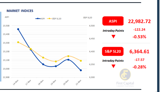 The Colombo Bourse reverted to profit booking and ended the day in negative territory, marking the week’s closure in red. Cashing in by investors pushed the ASPI down by 122 points to end at 22,983.