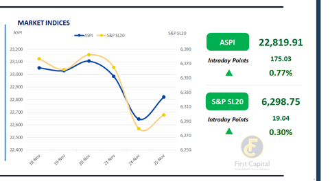 Moreover, S&PSL20 index climbed up 19 points to 6,299. CINS, NDB, MELS, BIL and SUN emerged as the top positive contributors to the index. Although retail participation was moderate, High net worth investors were highly active today.