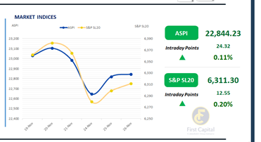 The Colombo Bourse carried forward yesterday’s positive momentum into the first half of today’s session amidst a bit of volatility, yet managed to close the day in green with the ASPI closing at 22,844, up 24 points, while the S&P SL20 advanced 13 points to close at 6,311.
