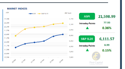 The ASPI posted a gain of 78 points and closed at 21,599. DIAL, HHL, GRAN, SUN and KCAB were the top positive contributors to the index. Both retail and HNW participation remained relatively average during the session.