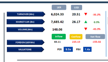 Additionally, more positive investor sentiment was observed towards Plantation sector counters. Foreign investors remained net sellers, recording a net outflow of LKR 155.0Mn.