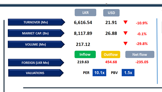 Turnover stood relatively low at LKR 6.6Bn, approximately 12% below the monthly average of LKR 7.5Bn. The Capital Goods sector dominated activity, contributing 23% to total turnover, while the Banking and Diversified Financials sectors collectively accounted for 32%. Meanwhile, foreign investors remained net sellers, recording a net outflow of LKR 235.1Mn.