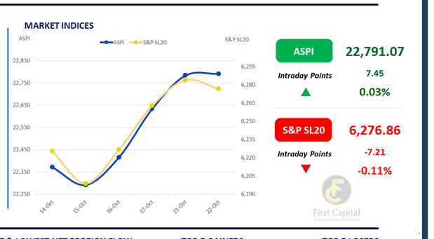 The Colombo Bourse witnessed mixed sentiment during the session but ultimately closed in positive territory, with the ASPI recording a marginal gain of 7 points to end at 22,791.