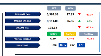 The Capital Goods sector dominated activity, accounting for 20% of total turnover, followed by the Utilities and Banking sectors, which together contributed 25%. Meanwhile, foreign investors continued to remain net sellers, recording a net outflow of LKR 372.5Mn for the day.