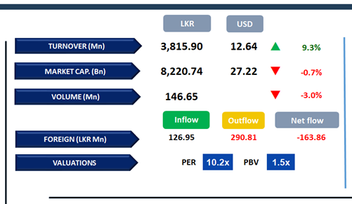 Foreign investors remained net sellers, recording an outflow of LKR 163.9Mn for the day.