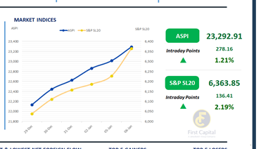 The previous bullish tone persisted in the Colombo Bourse yesterday as well, lifting the ASPI by 278 points to close the day at 23,293. The index exerted a steady upward momentum during the day, heavily weighing on the buying interest towards Banking sector counters.