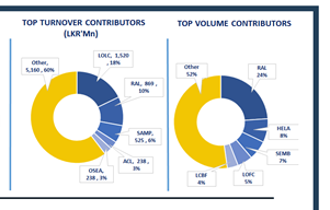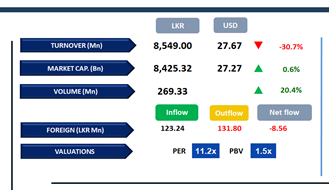 The Diversified Financials counters contributed 25% of total turnover, while Food Beverage & Tobacco and Capital Goods sectors together accounted for 32%. Foreign investors remained net sellers, posting a net outflow of LKR 8.6Bn.