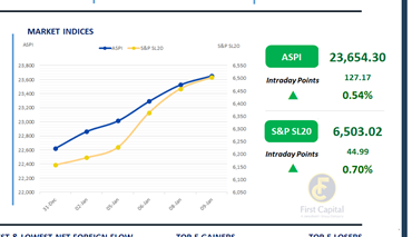 Price movements were orderly and low in volatility, indicating steady buying interest and improving investor confidence. The ASPI rose by 127 points to close at 23,654, while S&P SL20 index moved up by 45 points to close the day at 6,503.