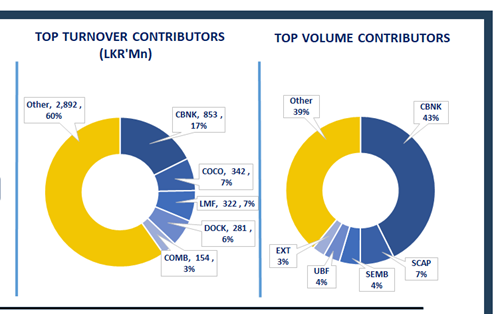Top negative contributors to the ASPI were RICH, CFIN, JKH, RIL and AEL. Share prices of 125 companies declined during the session, while only 106 recorded positive contributions. HNW participation was limited and retail investors’ participation also remained subdued.