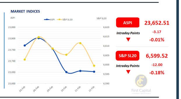 Despite the early upward momentum both the indices marginally dropped as the ASPI declined by 3 points to 23,653, while the S&P SL20 dropped by 12 points to 6,600.