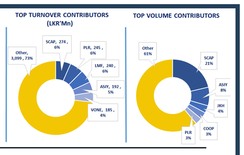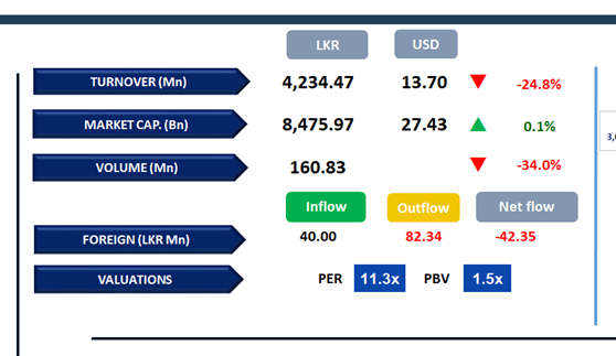 Daily turnover was below average level standing at LKR 4.2Bn. Turnover dropped 37.7% over the monthly average of LKR 6.8Bn. Capital Goods sector led the daily turnover with a share of 22%, followed by the Banking, and Food Beverage & Tobacco sectors collectively contributing 30%. Foreign investors remained net sellers, posting a net outflow of LKR 42.3Mn.