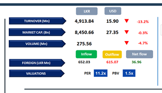 Capital Goods sector led the daily turnover with a share of 21%, followed by the Diversified Financials, and Telecommunication sectors collectively contributing 23%. After 22 days of constant foreign outflows, foreign investors turned to net buyers, posting a net inflow of LKR 37.0Mn.