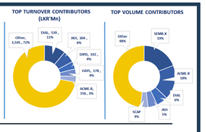 Leading negative contributors to the ASPI were SAMP, DOCK, DIAL, DFCC and COMB. HNW investor participation remained subdued, while retail investor activity was high, particularly in retail trading stocks. Daily turnover stood at LKR 4.9Bn, marking a decrease of 26.9% over the monthly average of LKR 6.7Bn.