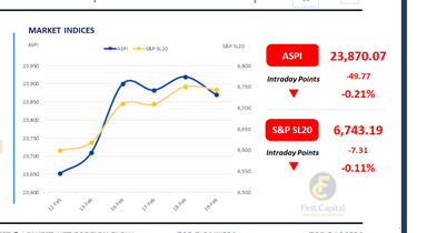 The Colombo Bourse indices showed a mild but steady intraday decline, indicating cautious and slightly bearish sentiment. ASPI is down by 50 points, closing at 23,870, while the S&P SL20 has slipped roughly 7 points to settle at 6,743, with both indices showing early morning strength followed by gradual selling pressure through the afternoon.