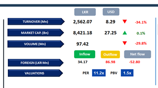 This was followed by the Capital Goods, and Materials sectors which produced a joint contribution of around 29%. Foreign investors remained net sellers, recording a net outflow of LKR 52.8Mn.