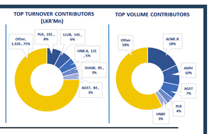 Turnover for the day stood subdued at LKR 2.6Bn, representing a 61% decrease from the monthly average of LKR 6.6Bn. The Banking sector stood out as the topmost contributor to today’s turnover, accounting for a share of 17%.