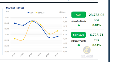 The Colombo Bourse started the week on a mildly positive note, with the ASPI registering a modest gain of around 9 points to close the session at 23,783.