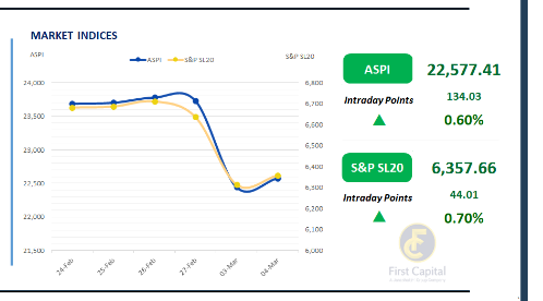 Driven by buying interest at bargain prices, the ASPI gained 134 points to close at 22,577, recording a turnover of LKR 4.7Bn, marking a 20.0% decline compared to the monthly average turnover of LKR 5.8Bn.