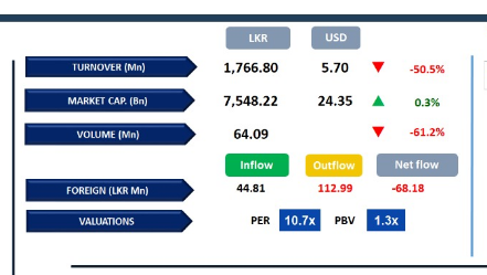 Daily turnover stood at LKR 1.8Bn, marking a decrease of 62.5% over the monthly average of LKR 4.7Bn. Capital Goods sector led the daily turnover with a share of 26%, followed by the Banking and Materials sectors collectively contributing 33%. Foreign investors remained net sellers, posting a net outflow of LKR 68.2Mn.